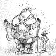 On y trouve aussi un animal très utile aux paysans : le buffle musqué. Très utilisé pour tirer les carrioles et les charrues, il doit être ferré régulièrement. De plus, il mange peu et tracte facilement des charges extrêmement lourdes. Il semble a priori être le compagnon idéal de l'agriculteur. Mais un inconvénient assez désagréable empêche l'usage du buffle musqué comme animal de trait dans les villes. En effet, l'animal dégage une forte odeur, un fumet incroyablement pestilentiel rappelant assez le pet de troll. Il paraitrait que les citadins ont les narines plus sensibles que les ruraux. |